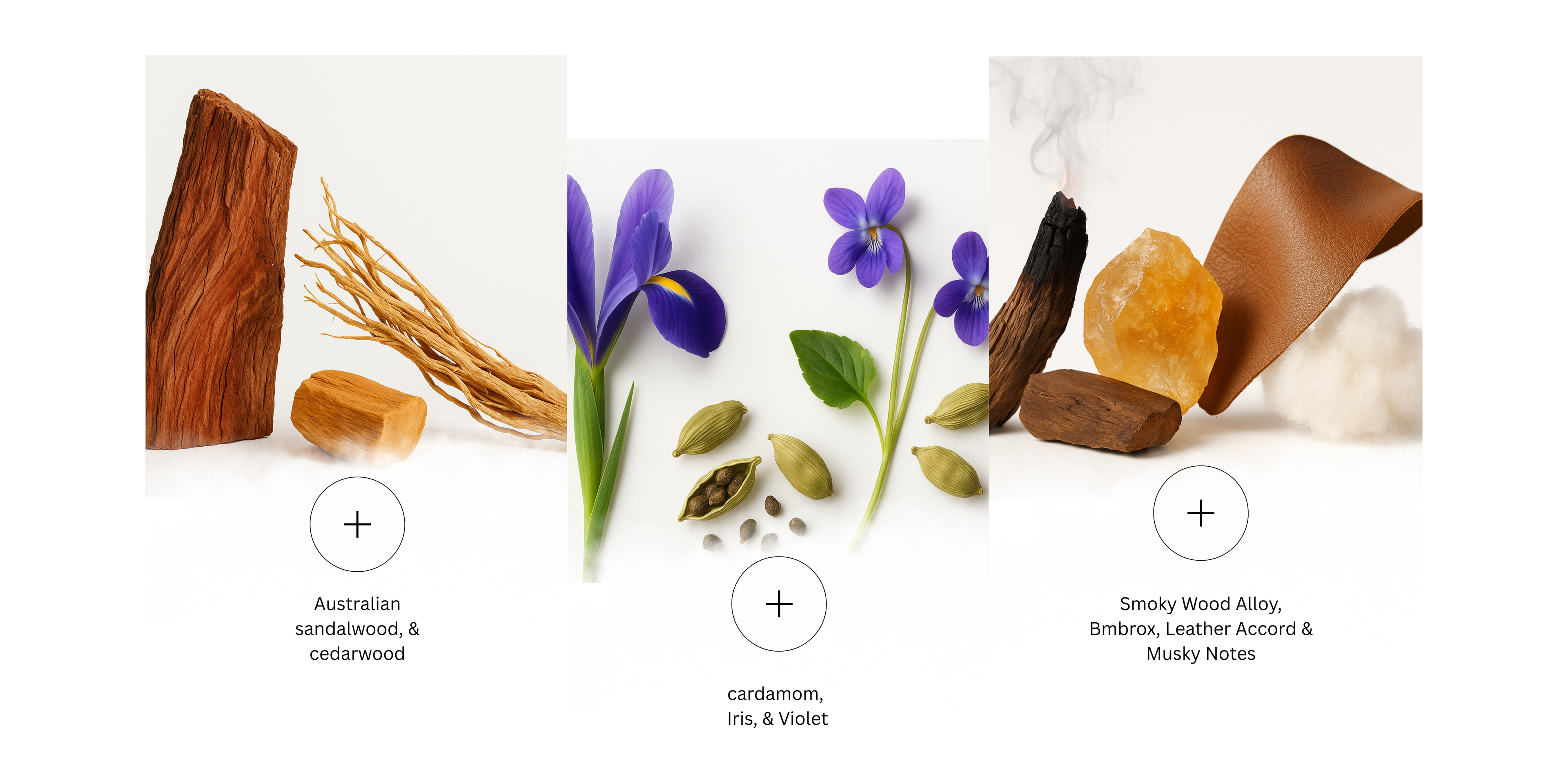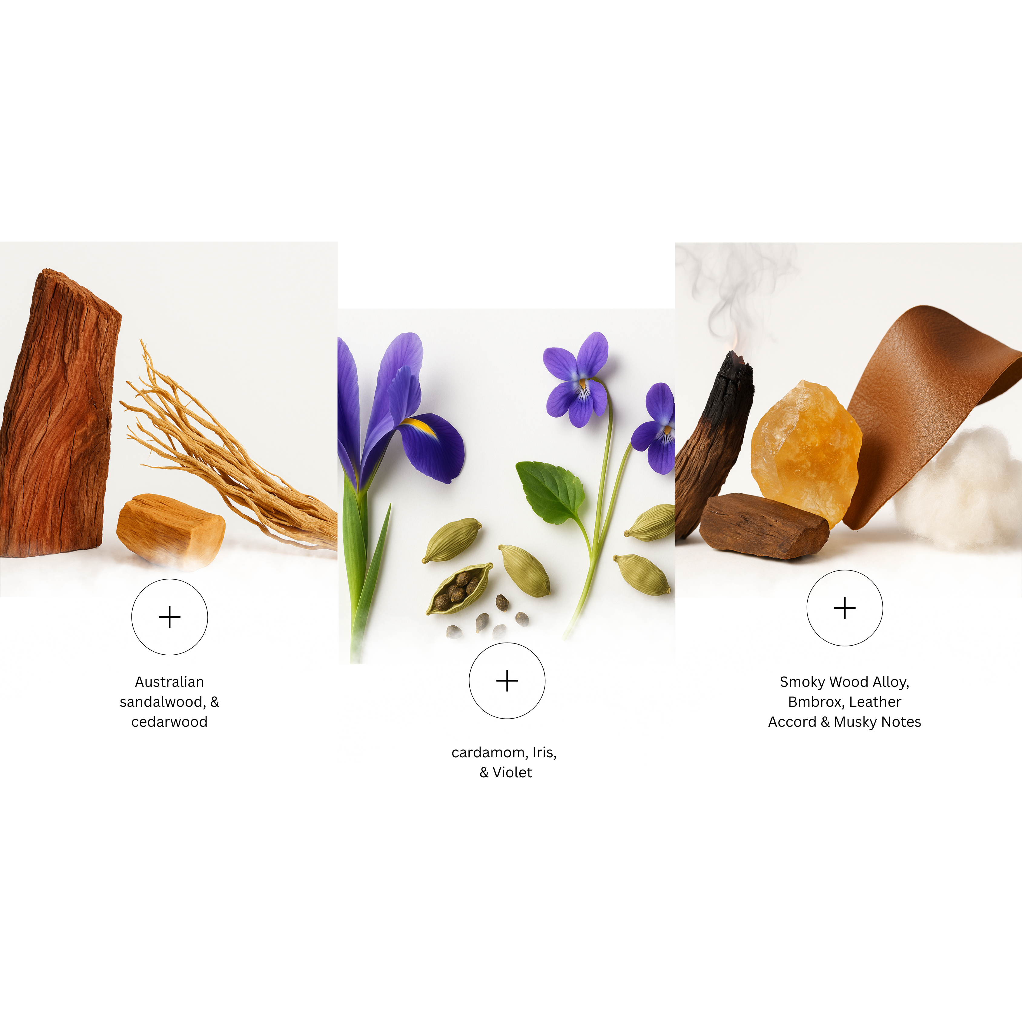 Experience the perfect harmony of spicy cardamom, powdery iris, and soft violet at the top, creamy sandalwood and smoky cedarwood at the heart, and warm leather, musky undertones, and amber-like ambrox at the base.